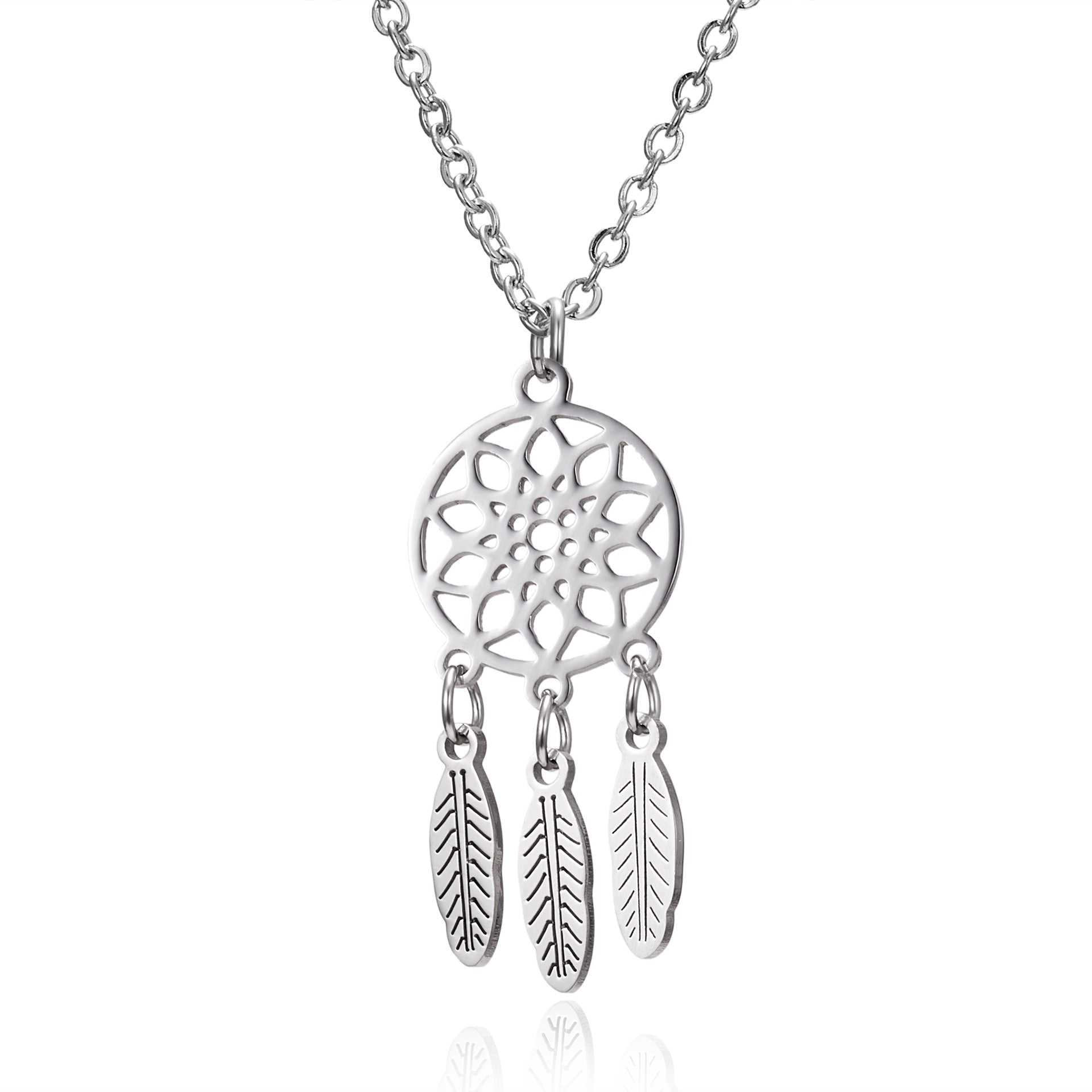 Un talismán de protección, esperanza y buenos sueños. Su red se cree que atrapa las pesadillas, permitiendo que solo los buenos sueños se deslicen por las plumas. Este colgante presenta una esfera calada detallada y tres plumas colgantes.