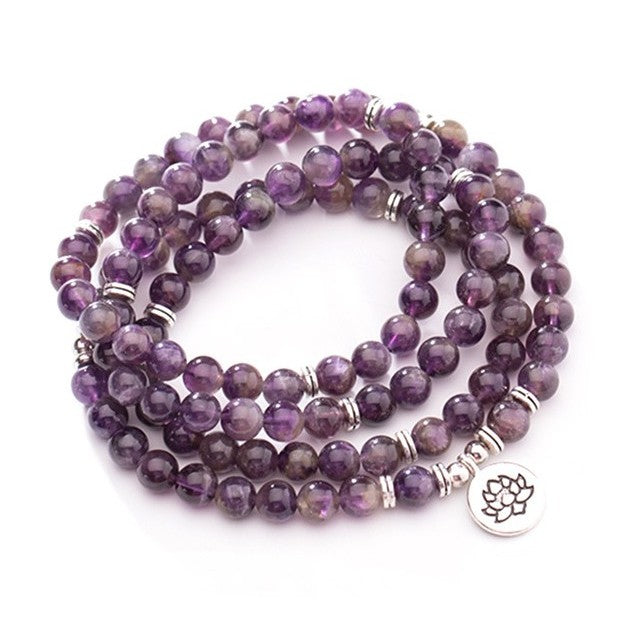 Este mala de Amatista natural está elaborado con amatista auténtica de alta calidad, una piedra asociada con el Chakra del Tercer Ojo, la intuición y la conciencia espiritual.